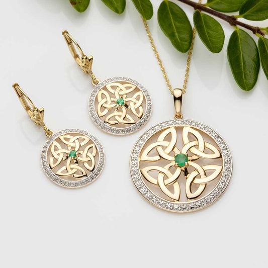 Irish Necklace | 14k Gold Emerald & Diamond Circle Trinity Knot Celtic Pendant