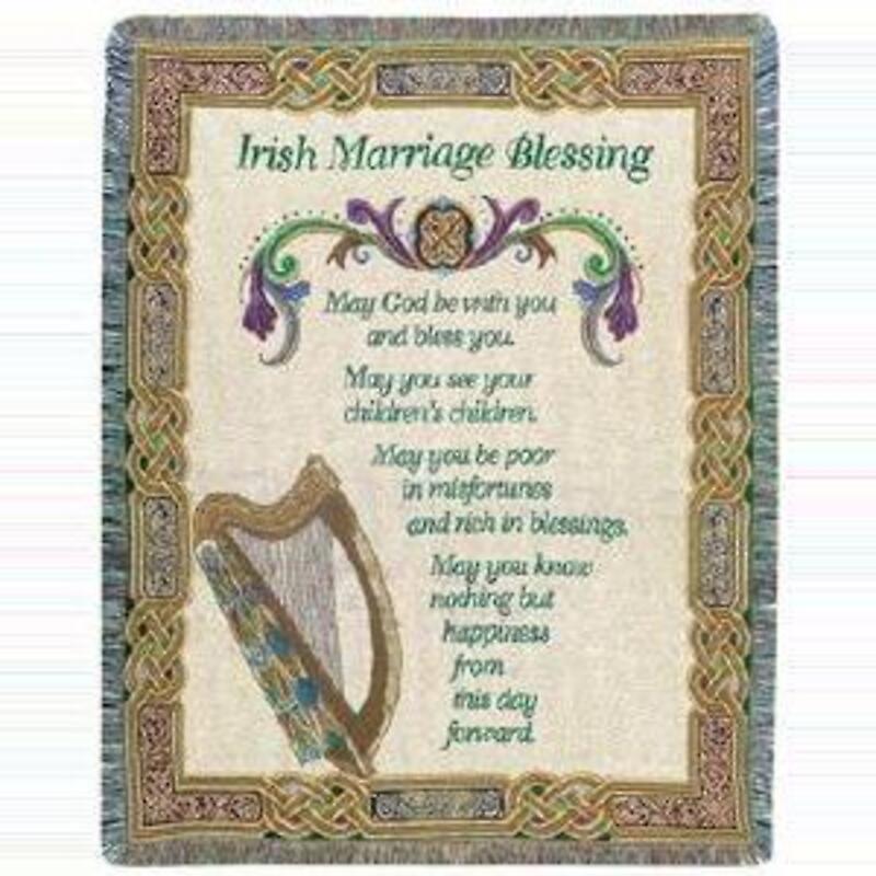 With a handsome border of colorful Celtic knots this cotton throw is inscribed with a beautiful blessing for the married couple. 54 inch x 70 inch cotton. Shipped separately - please allow 7-14 business days for delivery.