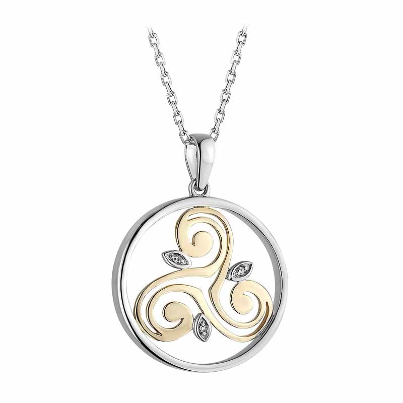 A captivating Irish Necklace featuring a 10k Gold Celtic Triskele framed within a circle of Sterling Silver. The contrasting tones make for an eye catching look that works with any style, while a a trio of delightful diamonds add further sophistication. This symbol found at the ancient site of Newgrange in Ireland is said to represent energy. Matching Earrings code: IJSV33117 also available.