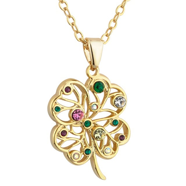 You can enjoy the Luck o' the Irish with this four leaf clover necklace. Gold plated and decorated with colorful synthetic gemstones, this lucky Irish pendant comes on an 18 inch chain. By Solvar Jewelry, Dublin, Ireland.