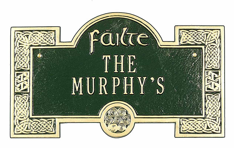 Highly durable - each plaque is cast one at a time, ensuring quality. Made in the USA from rust-free recycled aluminum (eco-friendly). Hand finished in weather-resistant paint that will withstand harsh weather conditions. Personalize the plaque with 2 lines of personalization. Both top and bottom line hold up to twelve 1.25" characters/spaces. The word "Failte" is standard on each plaque. Personalized font is raised and in all upper case. Available in 6 color options: BG=black/gold, GG=green/gold, OG=bronze/gold, BS=black/silver, AC=antique/copper, and GS=green/silver. 15.25" x 9". Made in the USA. Shipped separately - please allow 2-3 weeks for delivery.
