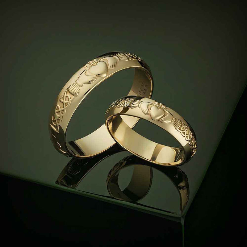 The Claddagh Ring symbolizing love, loyalty and friendship, ao meaningful as a wedding band. Beautiful 14k gold design with a claddagh and Celtic knotwork surrounding the band.
