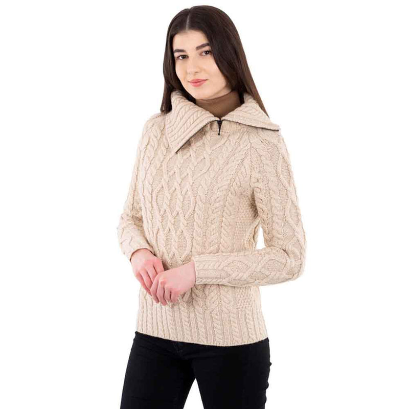 Irish Sweater | Ladies Zipper Neck Aran Knit Sweater